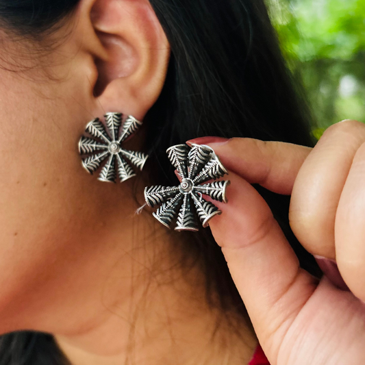 Pushpa Chakra Studs – Premium German Silver Earrings by DAYERA