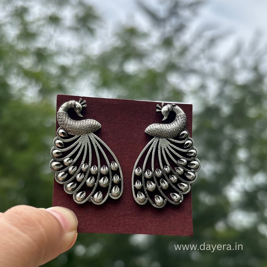 Mayura Studs – Handcrafted German Silver Peacock Earrings by DAYERA