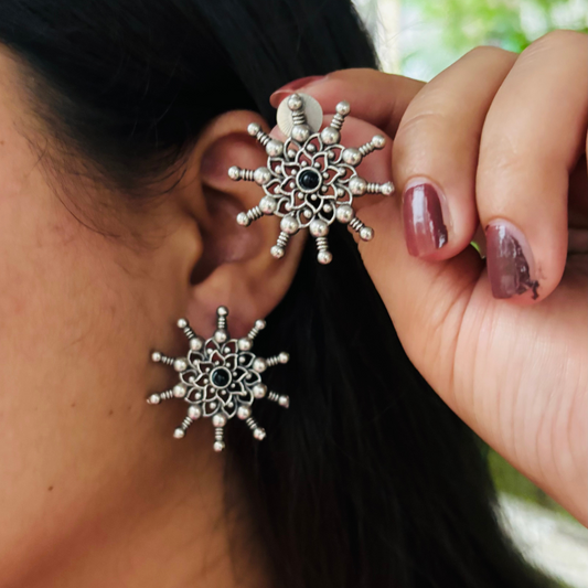 Pushpa Chakra Studs – Premium German Silver Earrings by DAYERA